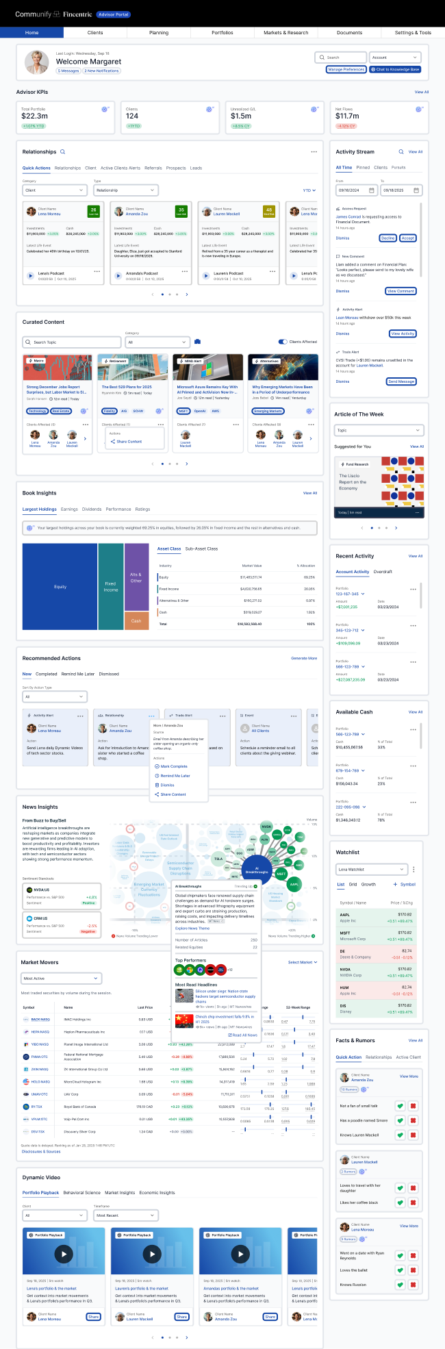 This is one of the first things an advisor would see upon entry into their dashboard. I helped organize the data better, improve UI clarity and added in personal information about the client. Special shout out to the inclusion of our AI generated client podcasts which tell us about our clients’ portflio performance and holdings news.